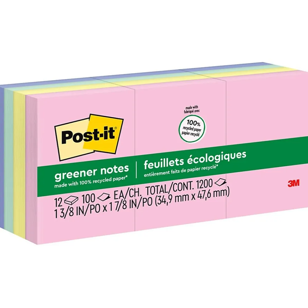 Post-it Greener Notes are the greener version of the original Post-it Notes you know and love. Made with water-based adhesive and 100% recycled paper. Use the 1 3/8 in. x 1 7/8 in. size for notes or reminders to yourself or others. Unique adhesive designed for use on paper or in planners. Full of pastel perfection, the Sweet Sprinkles collection brings a sweetness to your desk. Post-it Greener Notes are recyclable, and the paper is sourced from certified, renewable and responsibly managed forests. Cabinet pack keeps pads in a neat box until needed. 12 Pads/Pack, 100 Sheets/Pad.