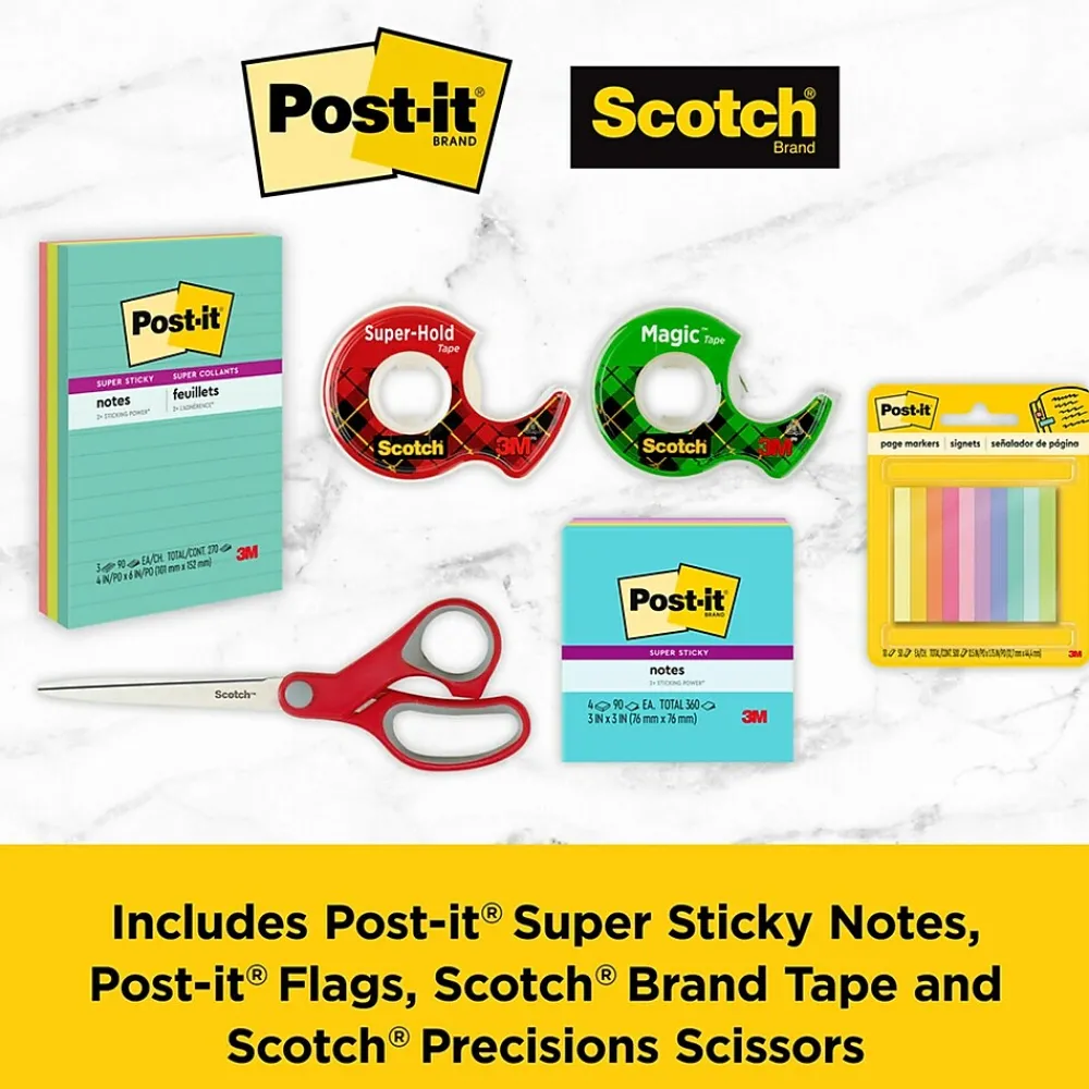 - BACK TO SCHOOL ESSENTIALS – Post-it Super Sticky Notes, 3 in. x 3 in. and 4 in. x 6 in. lined, Post-it Flags, Scotch Magic Tape and Scotch Super-Hold Tape and Scotch8 in. Multi-Purpose Scissors
