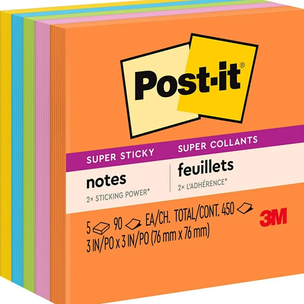 Uplift your spirits and messages via the vibrant, strong colors of the Energy Boost collection. Whether jotting down your daily to-do’s, brainstorming big ideas, studying or setting reminders, colors and ideas are always brighter together. These sticky notes feature 2X the sticking power. They also stick and re-stick – allowing you to move your notes with you throughout your day. They’re ideal for walls, doors, windows and other vertical surfaces, and like all Post-it Notes, they stick securely yet remove cleanly without damage. Keep your ideas across your notebooks, classroom books, calendars or other documents. No tape or tacks are needed with adhesive notes, saving you money and time on office products or school supplies. A great memo pad, these are ideal for using for notes or reminders to yourself or others. Post-it Super Sticky Notes are the perfect solution for shopping lists, reminders, notes on computer screens, time tracking, to-do lists, marking cables, color-coding documents, reminding kids to do chores, storyboarding, scratch paper and agile processing. Each notes sheet is approximately 3 in. x 3 in., with 90 sheets per pad and 5 sticky note pads per pack. These colorful sticky notes include colors from the Energy Boost collection including orange, pink, yellow, blue and green. All Post-it Notes are sourced from certified, renewable and responsibly managed forests, and all Post-it Notes are recyclable, so you can recycle them when they are no longer needed.