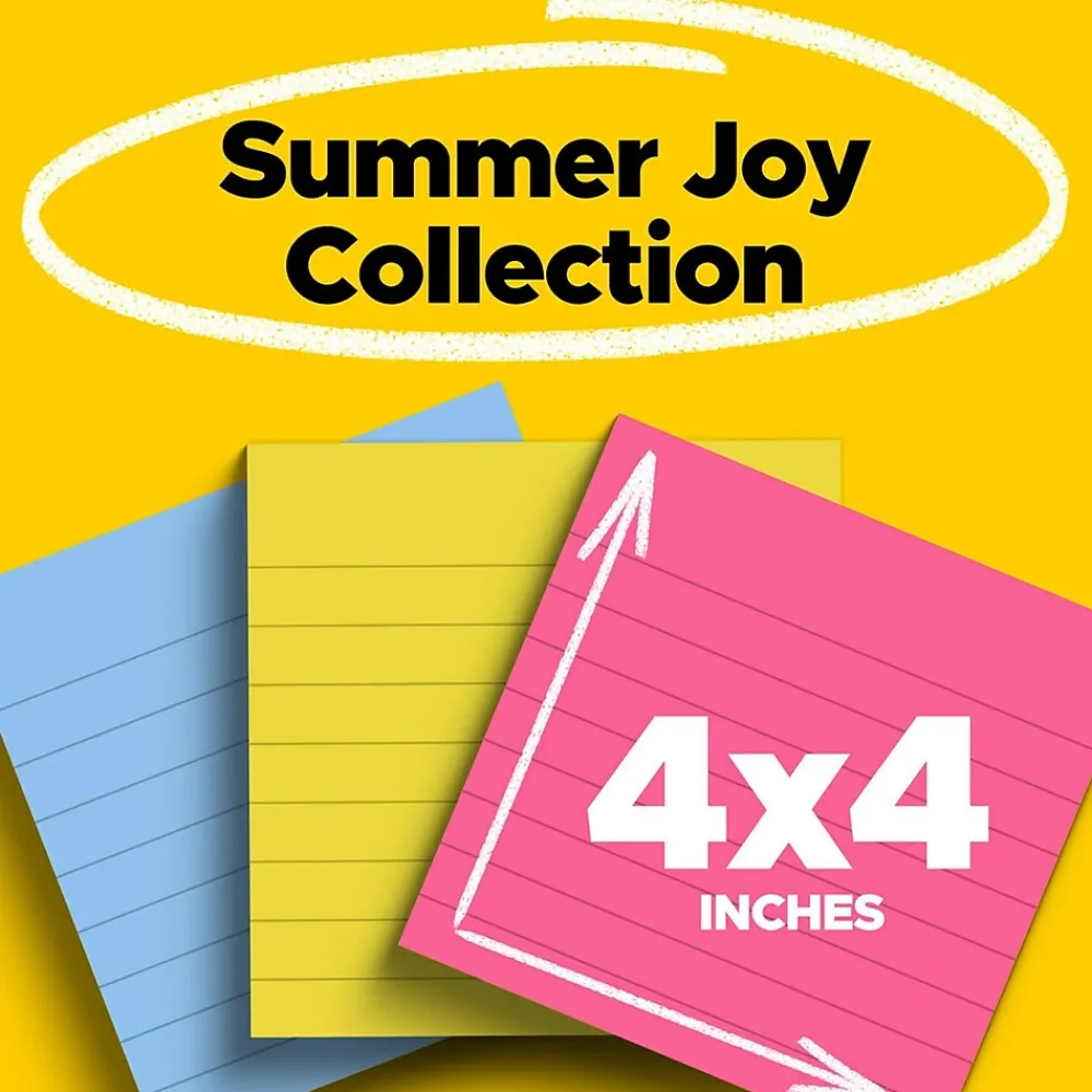 Post-it Super Sticky Notes in 4 in x 4 in feature 2x the sticking power. Use for lists or longer notes on doors, windows or walls. Unique adhesive reliably sticks and re-sticks so your message can stay front and center. Lined notes are great for to-do lists. Move your to-dos with you throughout the day. Share the warmth of the summer sunshine memories all year long with the Summer Joy collection. 6 Pads/Pack, 90 Sheets/Pad.