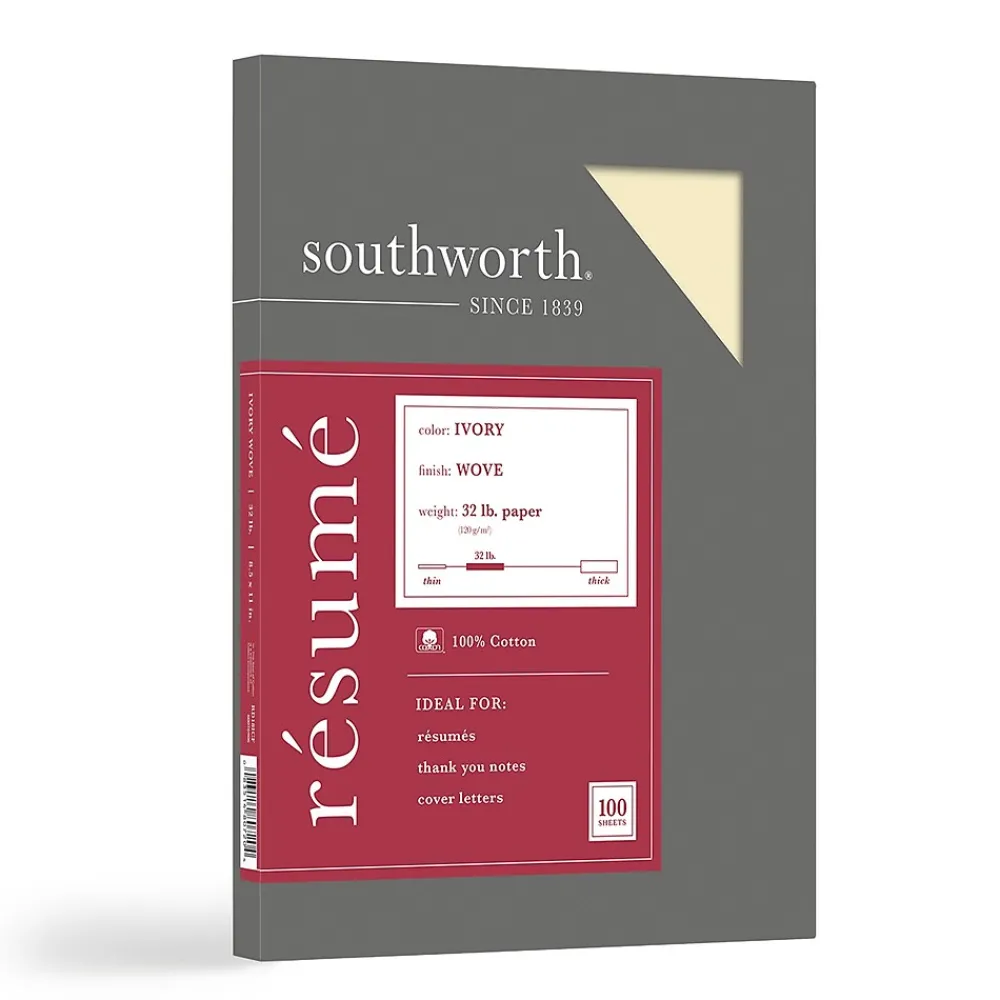 Enjoy fine-quality prints for archival projects with this ivory resume paper. The 32-pound acid-free and lignin-free sheets provide a sturdy printing surface to achieve crisp, clean results. These 100 sheets of Southworth resume paper work on copiers, laser, and inkjet printers to produce a variety of business or professional documents.