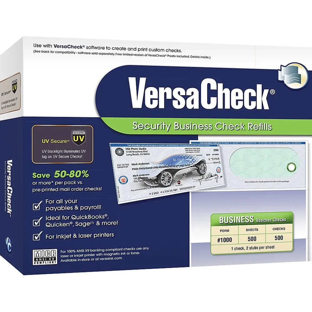 VersaCheck UV Secure business voucher check refills are the perfect high-security blank check paper designed specifically to use with all VersaCheck software products, except personal versions, to print custom business checks that comply 100% with ANSI X9 banking standards. Save 50-80% or more per pack vs. pre-printed mail-order checks. This package contains 500 sheets of UV Secure green elite business-size checks. Each sheet includes one check on the top third of page, two stubs below, and micro-perforation from top edge. Security features include UV invisible security marks, erasure protection, micro-print lines, security screens, and artificial watermarks. UV invisible security marks can be easily viewed with UV blacklights. Compatible with: VersaCheck, QuickBooks, Quicken, MS Accounting, MAS90, MYOB, and more. Blank check paper offers extra storage security and the convenience of updating checking information at anytime.