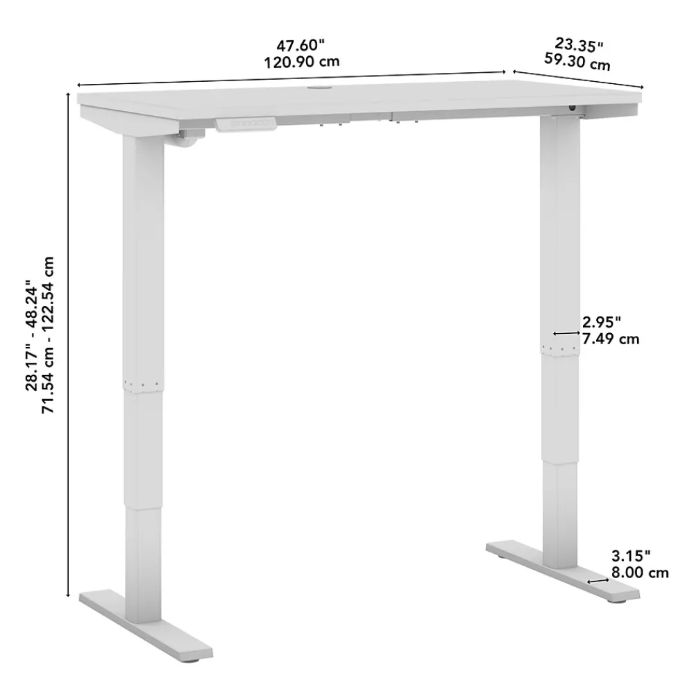 Bush Business Furniture’s Move 40 Series Electric Height Adjustable Standing Desk is a perfect way to build an ergonomic workspace without the high-end price tag. The 48W x 24D desktop lifts anywhere from 28 to 48 inches from the floor at a speed of 1.25 inches per second. The control panel includes four programmable presets that save your favorite heights so you can change positions without missing a beat. The Adjustable Desk also features an Anti-Collision Sensor that stops movement up or down if an object is detected. Built to endure the rigors of a busy professional environment, the thermally fused laminate work surface resists scratches and stains while a welded 16-gauge steel base allows the desktop to support up to 176 pounds. This Ergonomic Office Desk has been tested to meet or exceed ANSI/BIFMA standards for safety, durability and performance and is backed by a 5 Year Warranty.