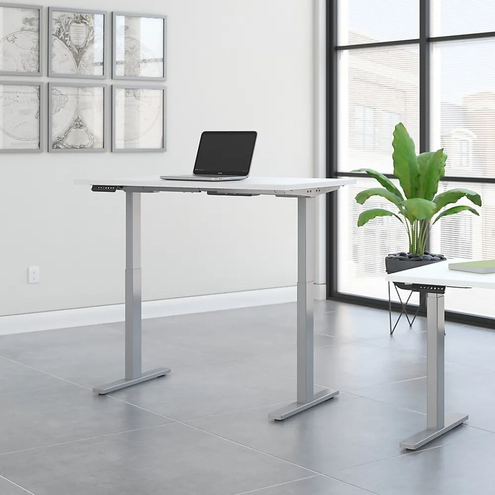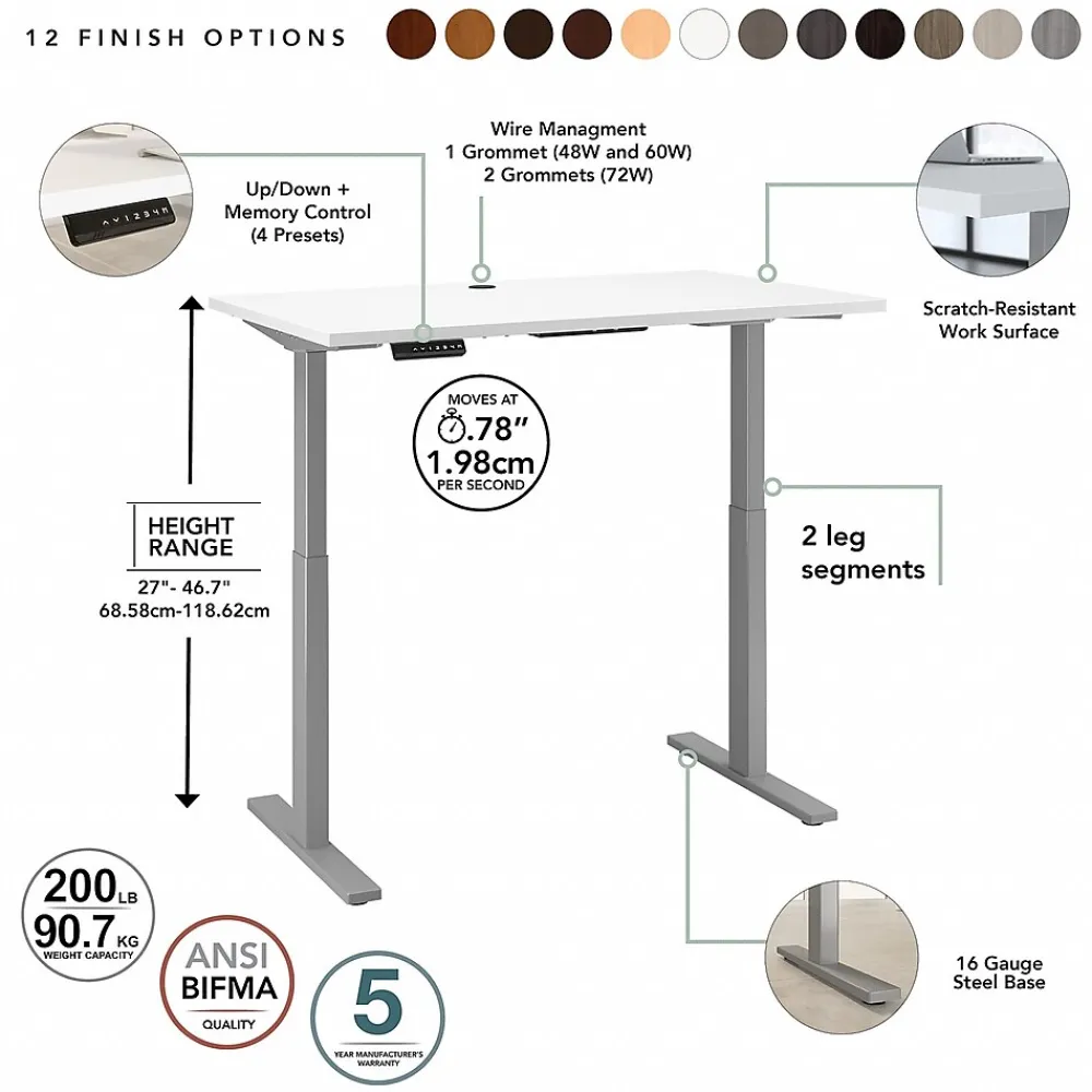 Have a healthy and productive day at the office with the Move 60 by Bush Business Furniture 48W x 24D Height Adjustable Standing Desk. Those who use sit to stand desks report improved attitudes, energy and comfort while getting more done, and the Move 60 provides an affordable solution. The electric adjustable height Desk smoothly lifts from a low of 27 inches to a high of 46.7 at the push of a button. Store your favorite heights with four programmable presets. The ergonomic Desk withstands years of everyday use. A durable thermally fused laminate finish resists scratches and stains, while the sturdy steel base creates a weight capacity of up to 200 pounds. This sit to stand Desk will have no problem holding all of your work materials. Backed by a 5 Year Warranty, the Height Adjustable Standing Desk meets ANSI/BIFMA quality test standards.