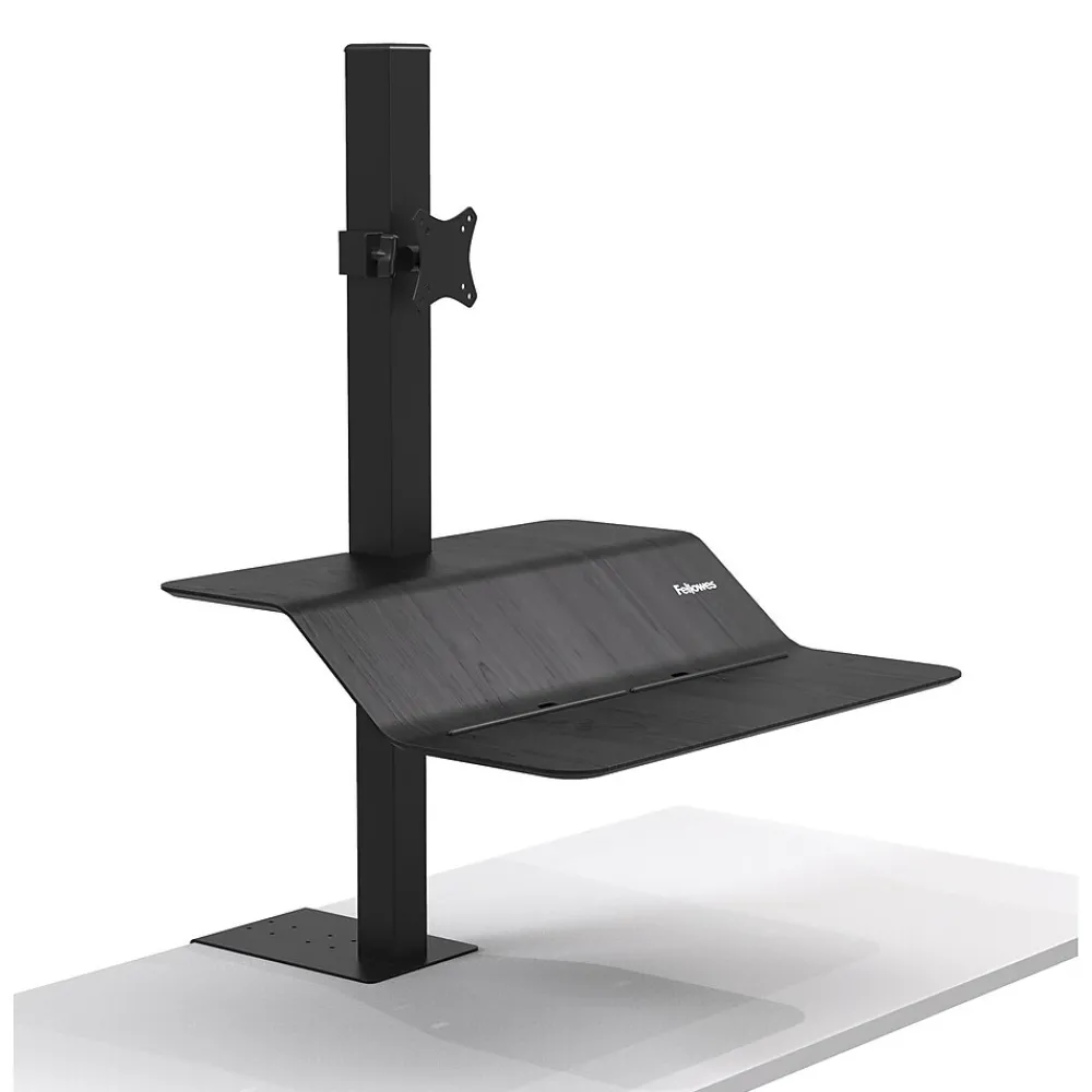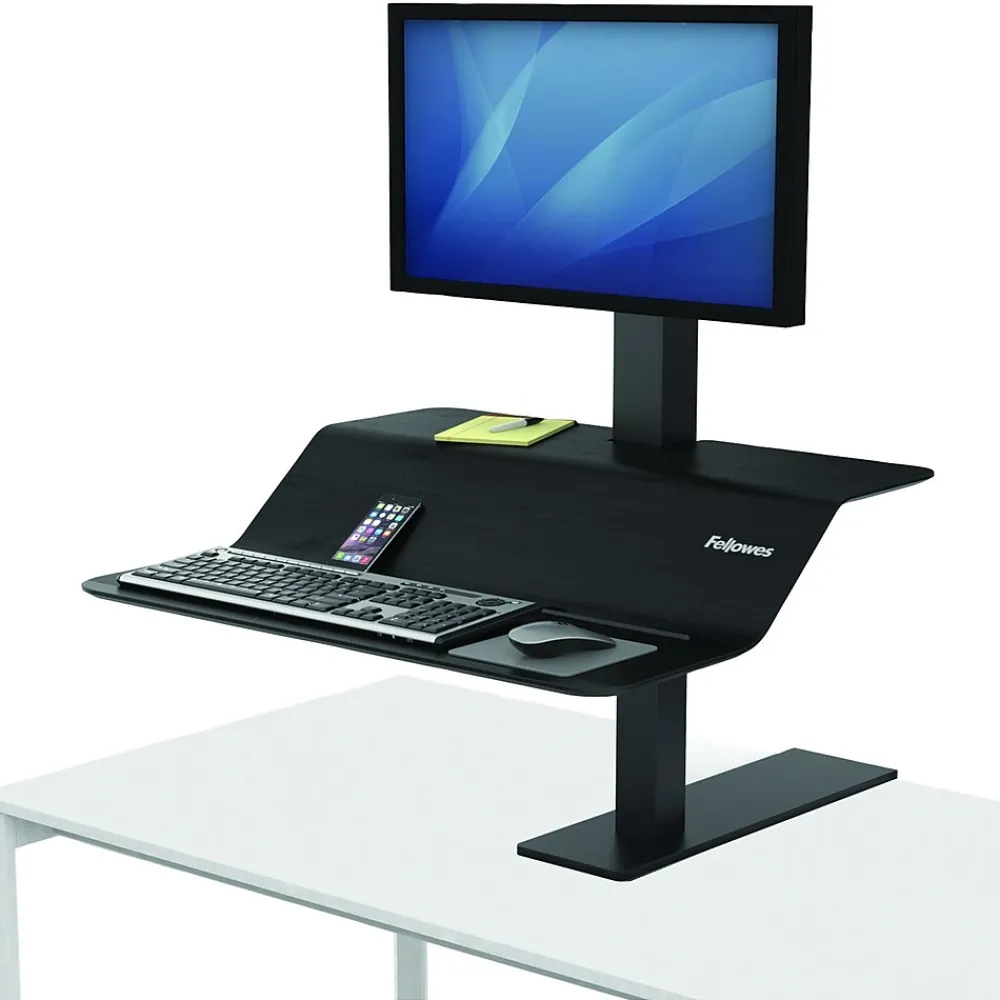 The Fellowes Lotus VE Sit-Stand Workstation is ideal for use in office or home and features the perfect combination of style and strength. The Smooth Lift Technology allows you to transition from sitting to standing effortlessly. Its dual work surface with the waterfall design provide useful space and stability to support all of your essentials. The integrated cord management keeps your desk free of tangled cords. This workstation features 15 in. of vertical adjustment so you can work in a position that’s comfortable and perfect for you. It easily accommodates monitors up to 20 lbs. with 25 lbs. of total weight capacity.