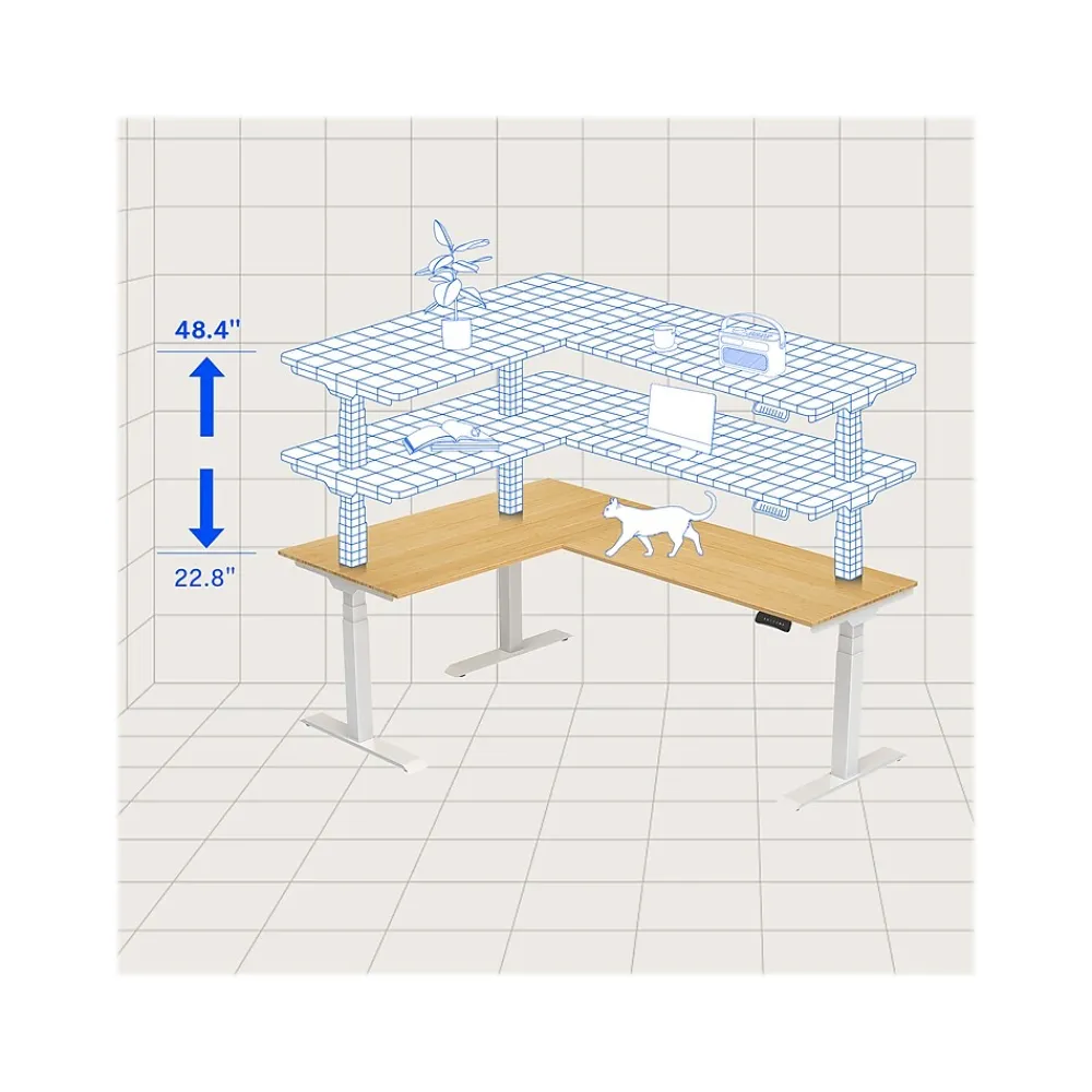 The FlexiSpot E7 is an L-shaped height-adjustable desk with white base and bamboo top. Powered by three motors, the desk can support up to 330 lbs. and travel at 1.5″ per second. Holeless columns are not just attractive, but also prevent the buildup of grease on the moving stages. The anti-collision feature reverses the direction of the desk if an object is struck during movement.