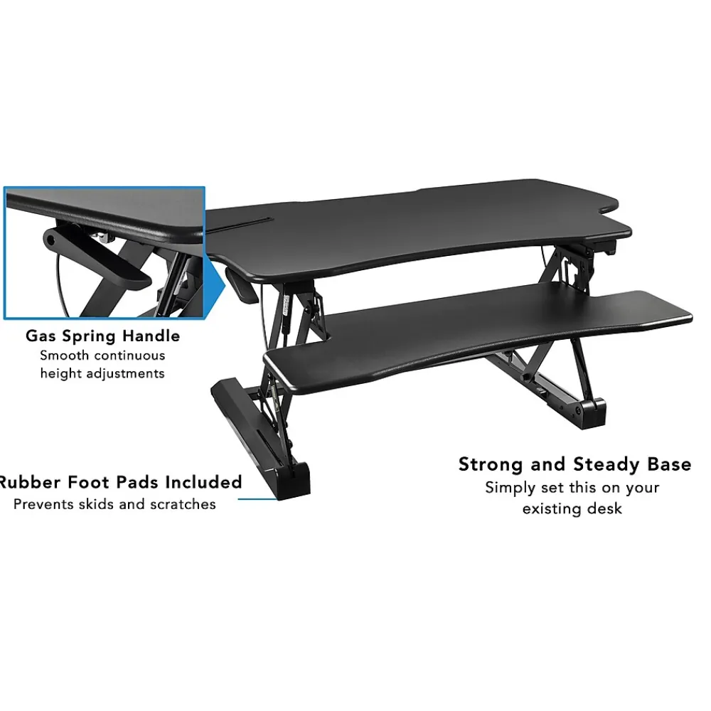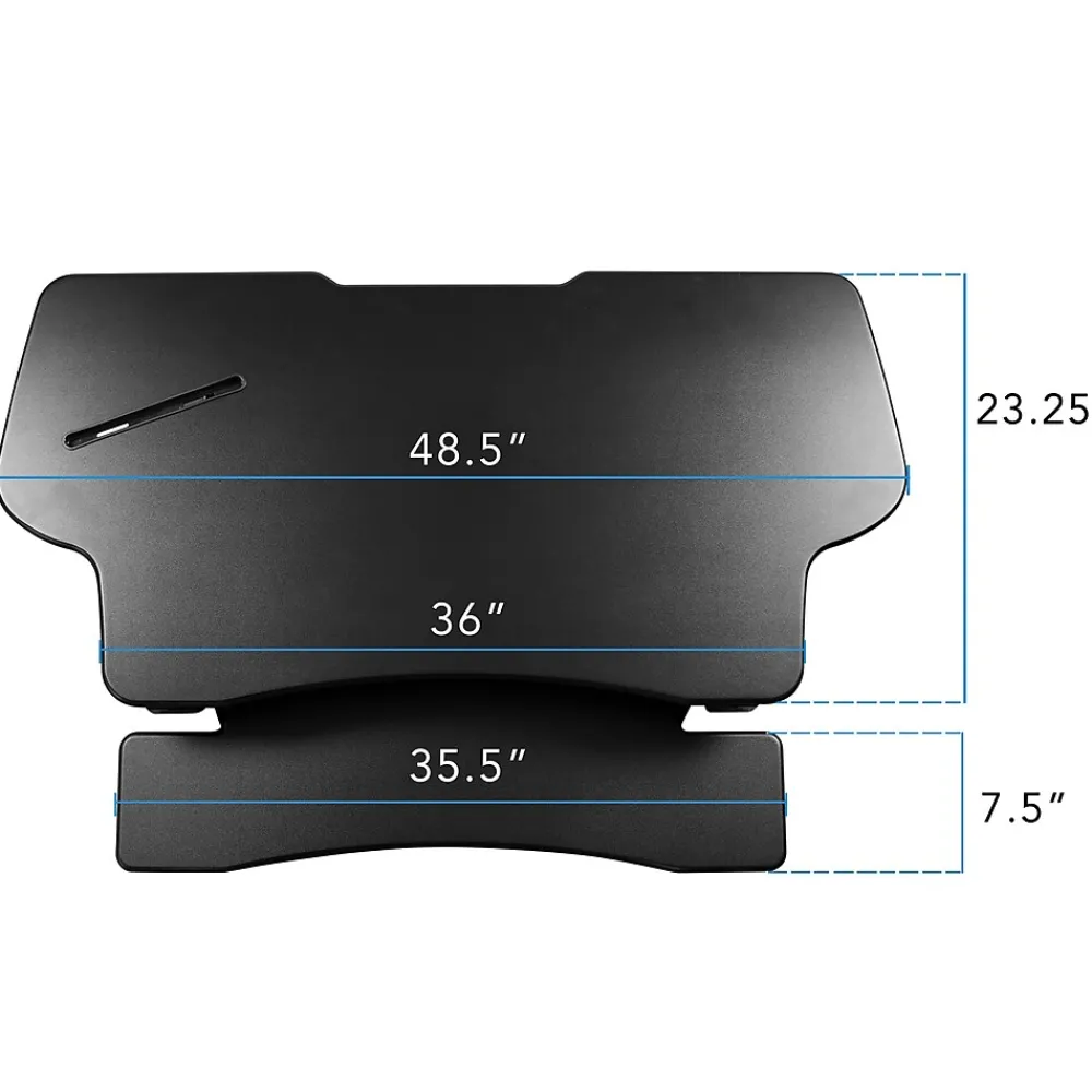 This sit-stand desk converter sits on top of your existing desk and allows you to work comfortably from either a sitting or standing position. Gas spring lift mechanism makes height adjustment almost effortless. The desktop platform and keyboard tray are large enough to support monitors, laptops, keyboard, and mouse side by side. Start experiencing the benefits of standing with this desk converter. It’s an easy, quick, and affordable way to transform your desk setup into a more active workspace. Enjoy the freedom of continuous height adjustment for a custom fit. Desk height adjusts from 6 inches up to a maximum 19.25 inches.