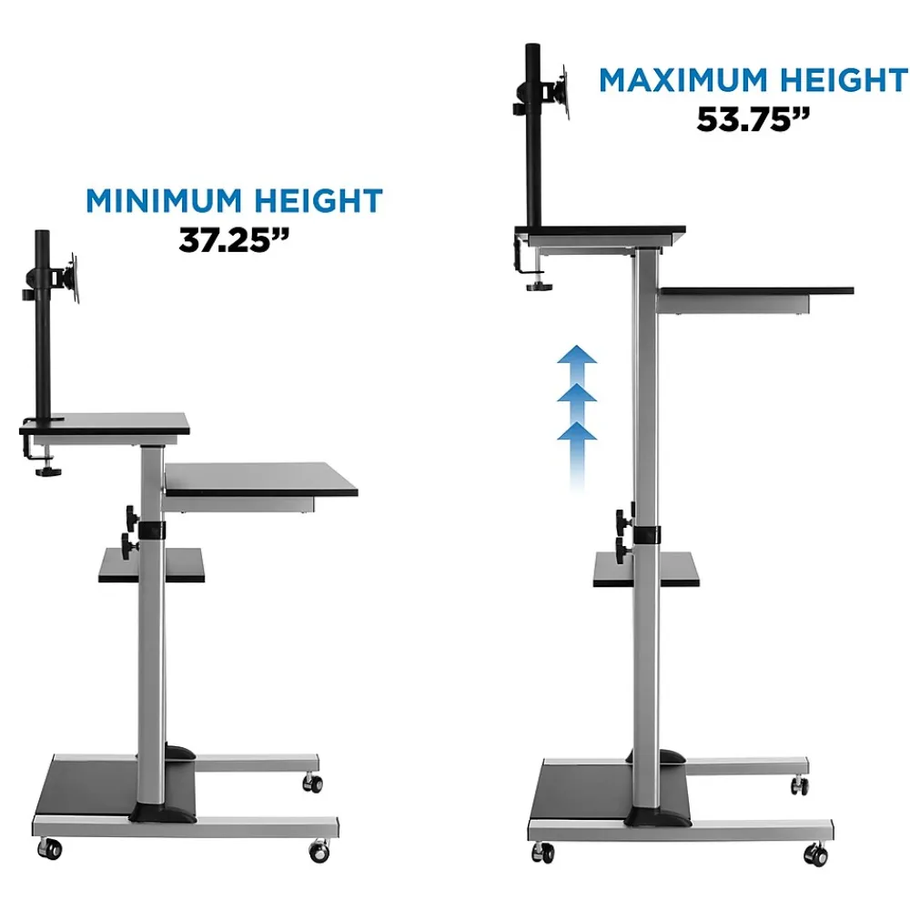 This is an ergonomic sit stand computer desk that allows you to raise and lower your work surface quickly and effortlessly to healthy sit-stand heights so you can work with more comfort. This portable desk also comes with a premium monitor riser/arm to raise the height of your computer monitor. Ideal for use as a mobile computer/laptop station for at the office, home, showroom, and classroom. Carefully designed platforms provide ample space for monitors, keyboards, mouse pad, a PC tower and a printer. Use with or without a monitor stand for an ergonomic layout. High quality steel frame with powder coating ensures durability and reliability. The height of the top two platforms can be adjusted from a maximum top shelf height of 54 inches to a minimum of 37 inches. 17 inches of height adjustment allows to for from a sitting position to a comfortable standing position.The locking casters allow the cart to be stationary or mobile when desired. Due to its size, maneuverability is excellent with total side width of 28” and a depth of 27.5”. Its ergonomic, portable, space saving attributes make it an attractive choice in all types of businesses, office, trade-shows, mall kiosks, retail stores, factories, schools, hospital even at home.