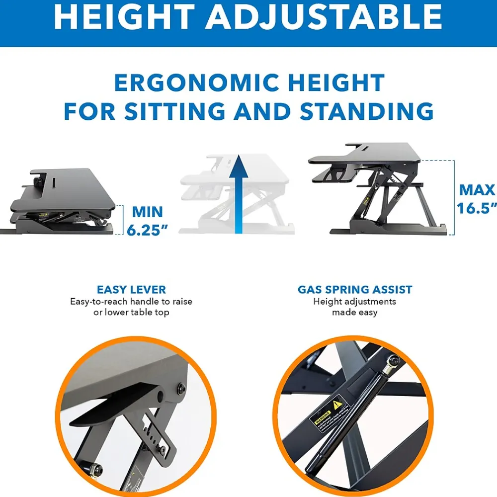 - EASY HEIGHT ADJUSTMENT: Sit to stand in seconds with this standing desk converter. The gas spring mechanism allows for smooth up and down height adjustments from 6.25″ to 17″, allowing you to find the perfect height.