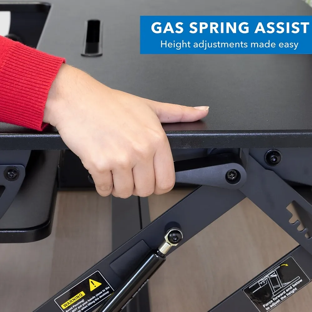 The MI-7926 is a height adjustable desk that sits on top of your existing desk and allows you to work comfortably from either a sitting or standing position. This desk converter is an affordable way to modernize your workspace. Changing positions throughout the day helps prevent strain and health issues that can arise from sitting for extended periods of time. The gas spring-assisted lift mechanism helps you adjust the height quickly and effortlessly.
