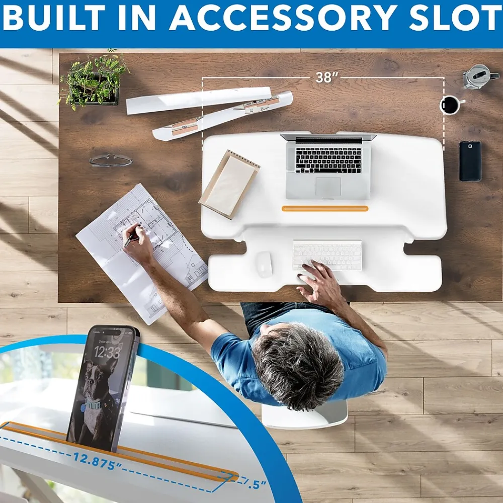 - DUAL MONITOR STANDING DESK: Improve your workflow and enjoy the wide tabletop space (38” wide), large enough for dual monitors or one monitor and one laptop with a built-in device slot to keep your phone or tablet securely in sight