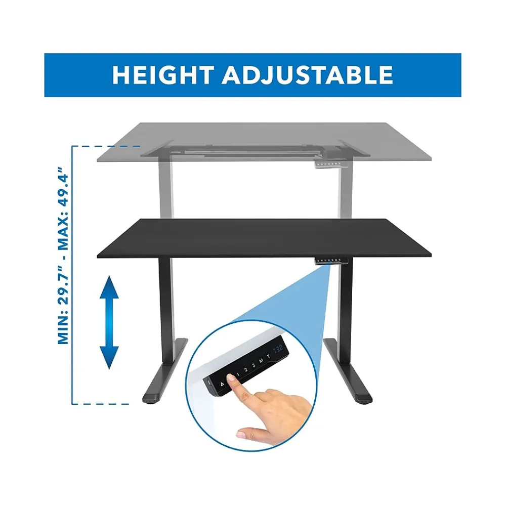 Add movement to your work day and improve health and productivity with this Mount-It! height-adjustable desk. This desk with black frame and black tabletop enhances any workspace at home or in the office. Enjoy quiet height adjustment between 29.7″ and 49.4″ at the touch of a button. The digital control panel with memory feature allows you to program up to three different heights so that the desk can be easily adjusted to your preferred sitting and standing positions. Additional features include a cable tray and leveling feet. Improve ergonomics and reduce the negative effects that sedentary work can have on your health with this electric sit-stand desk.