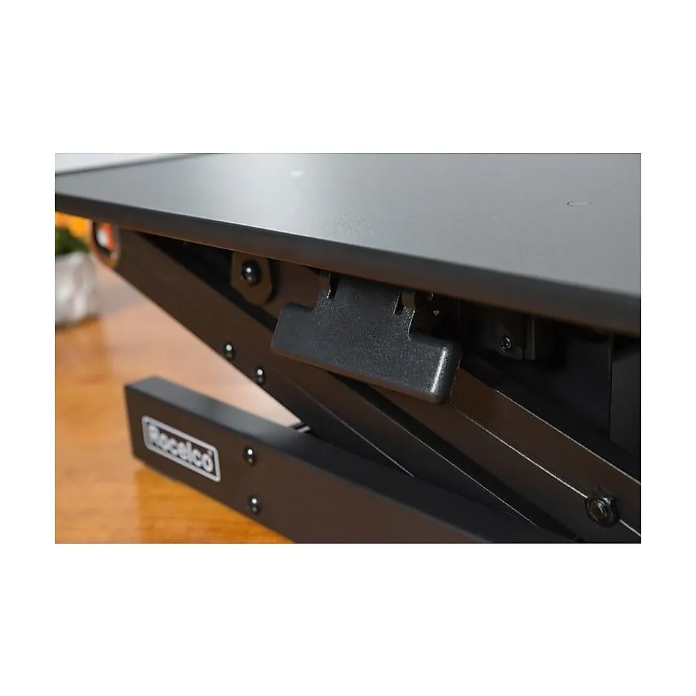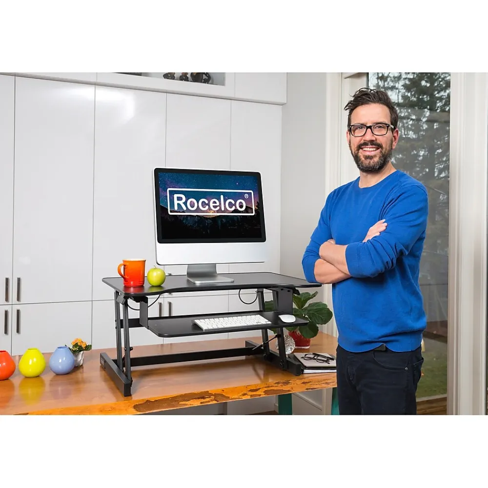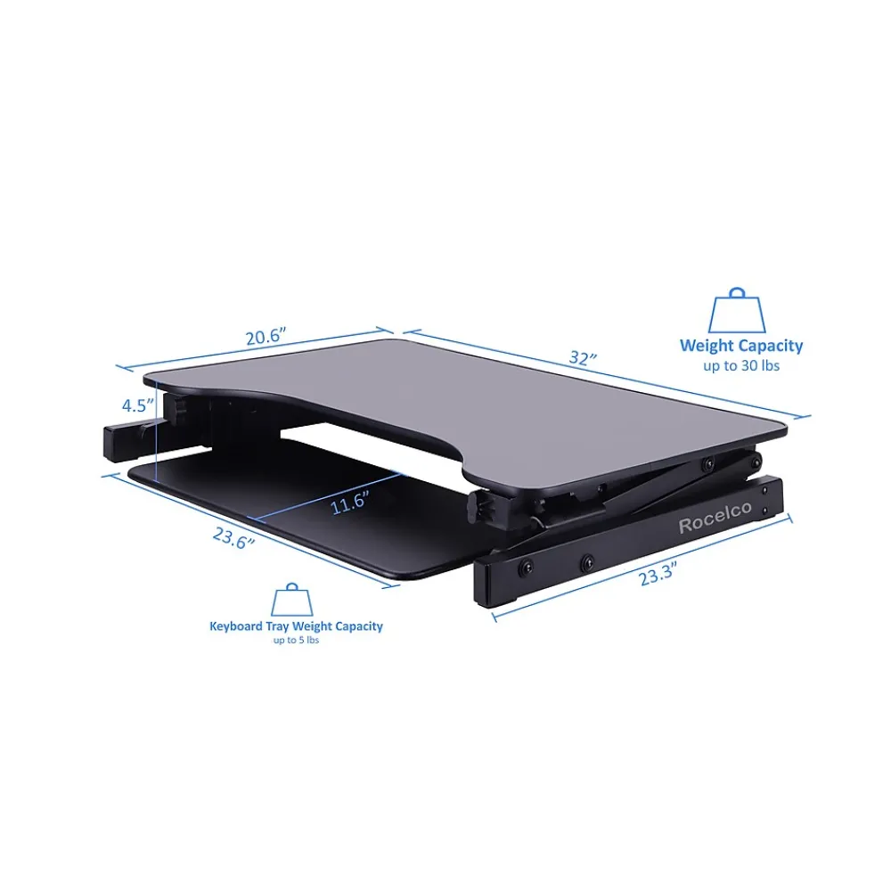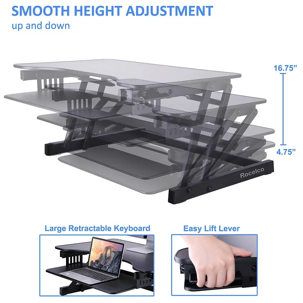 The R ADRB standing desk converter now optimizes your ergonomic work position with Enhanced Vertical Range, which seamlessly raises your tabletop up to 16.7″ and lowers it down to 4.75″. The large 32″ x 20.5″ desktop can hold up to 2 monitors along with other small accessories. Its full size 24″ x 11.5″ retractable keyboard tray holds a laptop or keyboard as well as a mouse. This sturdy adjustable workstation arrives fully assembled with nonskid pads to protect your desk from scratches. The black laminated finish will complement any color scheme.