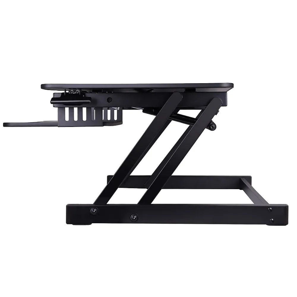 - Quick, easy, and stable height adjustment design: Sturdy metal frame with easy-grip side handle and gas piston assist, can raise and lower up to 35 pounds with continuous height adjustment from 5″ up to 17″ above desktop to optimize the ergonomic work position for people of most heights.