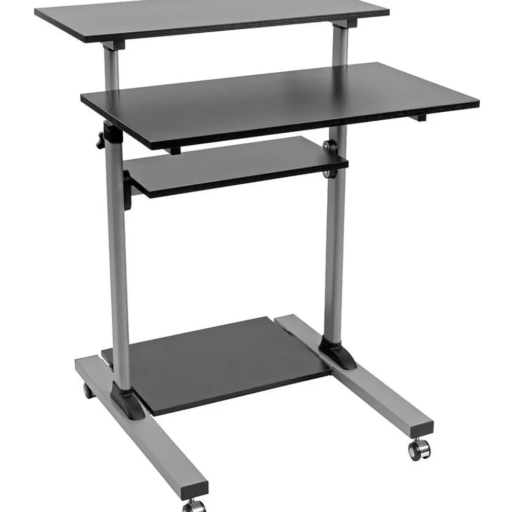 Rolling Workstation Lets You Enjoy the Benefits of Standing During Your Workday: This WorkWise mobile workstation desk on wheels lets you enjoy the benefits of better workspace ergonomics. Standing for part of the day can help increase metabolism, improve alertness and productivity, reduce fatigue and decrease the risk of repetitive stress injuries. Recommended for home, school or office use, the WWSSRC adjusts in height from 32 to 49 inches, allowing you to customize it to your comfort level. Take Your Work Wherever You Need to Go: This standing desk rests on four heavy-duty locking casters that allow you to roll the unit from room to room. Ideal for transporting a lesson plan from one classroom to the next or updating medical histories in a clinic filled with examination rooms, the WWSSRC allows you to go where the work takes you. Because it takes up less space than many popular computer desks, the WWSSRC is also ideal for small home offices. Convenient Shelves Keep Your Work Hardware Organized: This adjustable-height desk on wheels includes four platforms for holding a monitor, laptop, keyboard, CPU, printer, PDU, audio speakers or any other device needed for day-to-day operation. Each shelf supports up to 33 pounds.