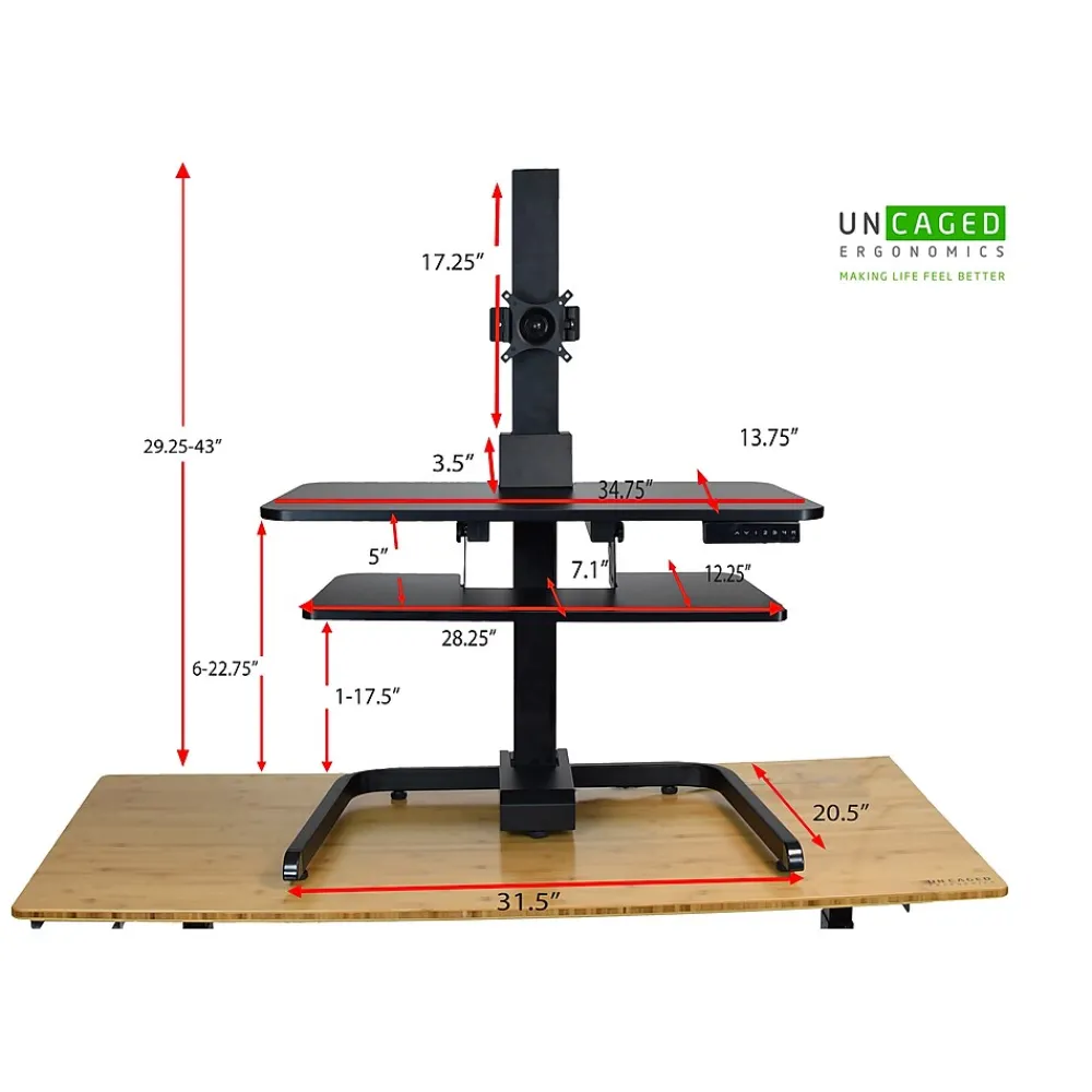 Sit, stand, & move throughout your day with our premium, motor-driven Electric Standing Desk Conversion. No Lifting! Featuring a tall adjustable height range that positions monitors at any height from 6″- 43″ (depending on the mounting position) above your desk! The universal VESA mount is independently height-adjustable, letting you swivel, pan and tilt monitors to the optimal viewing position.
