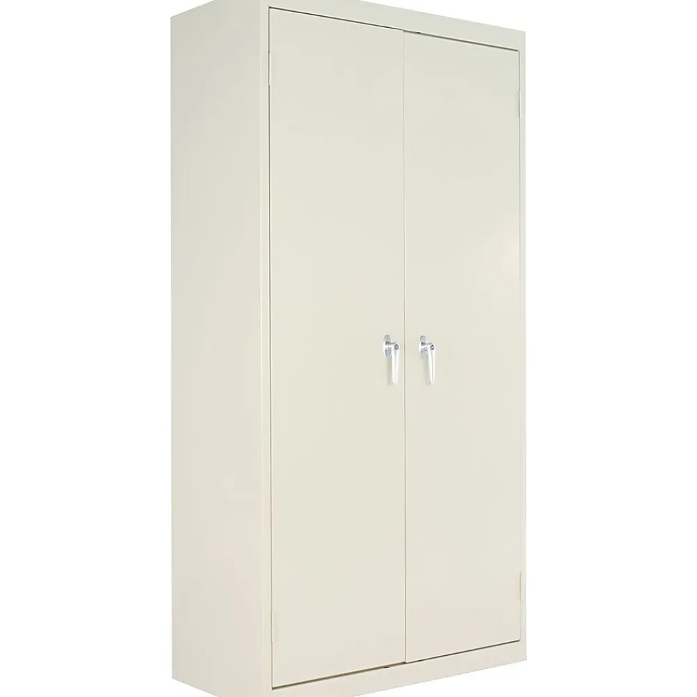 Alera Economy-Grade 4 shelf assembled storage cabinet in putty color features single point locking system secures each door to the fixed shelf. Storage cabinet has reinforced base with leveling glides and satin chrome double handles.