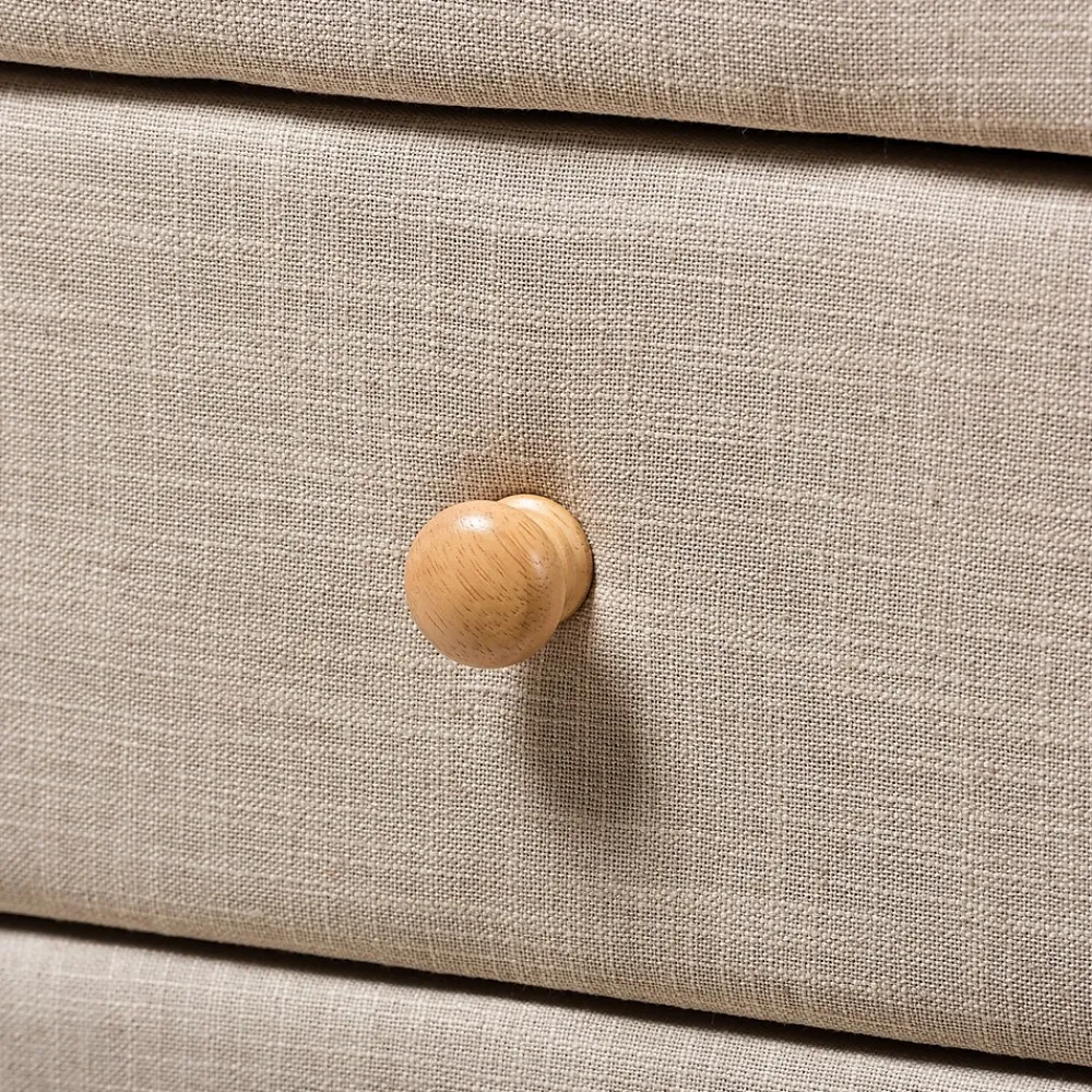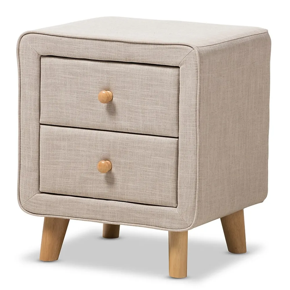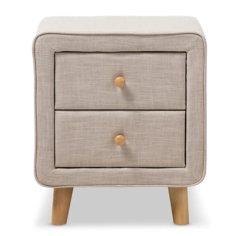 Featuring an upholstered frame and abundant storage, the Baxton Studio Jonesy 23″ High Nightstand is a unique and functional addition to the bedroom. The Jonesy is constructed from solid rubberwood and upholstered in beige polyester fabric. Two drawers provide storage for books, lotion, and other bedside necessities. Natural oak knobs on the drawers grant easy access. Inspired by mid-century modern design, the chest showcases light wooden splayed legs. The Jonesy nightstand is made in Malaysia and requires assembly.