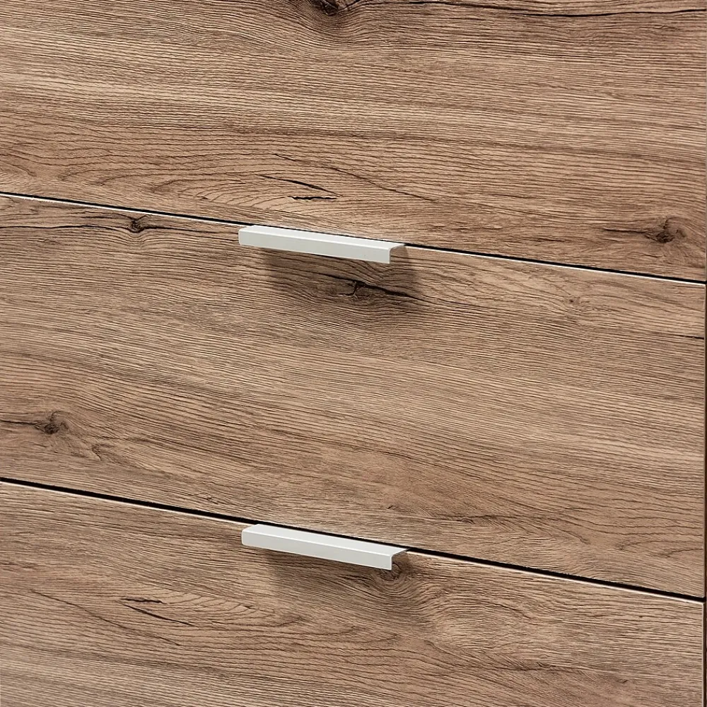 The Laverne 4-drawer chest is an essential piece of furniture that is both charming and simple. The modern and contemporary-inspired design is exemplified in the rectangular, geometric silhouette. The Laverne is finished in a natural oak brown to give you a hint of rustic and natural vibes. The chest features convenient top side drawer pulls on each of the four drawers, which roll out smoothly on slides. The minimalist chest, with its neutral coloring, will be easy to coordinate with the decor in your bedroom or guest room. The Laverne can even serve as additional storage in your entryway, living room, or closet. Made in Malaysia, the chest requires assembly.