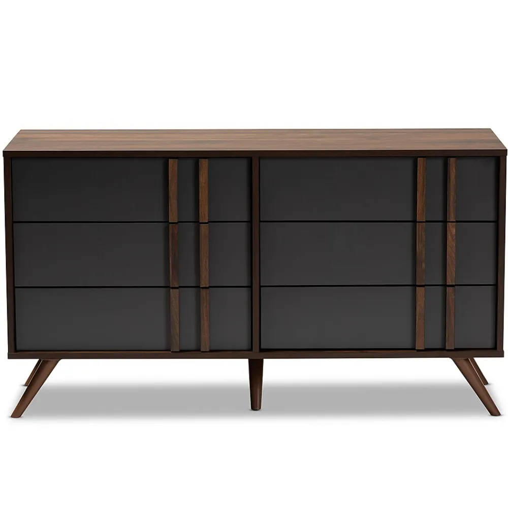 With an ultra-modern, two-tone finish and ample storage space, the Naoki dresser is sure to make an impression in any space. Made in Malaysia, this wood dresser features five spacious drawers to store clothes, linens, and more. Each drawer is fitted with metal glides for smooth movement. A two-tone grey and walnut finish are paired with long, double vertical handles for a cool, contemporary look. Requiring assembly, the Naoki dresser is supported by splayed legs that create a chic, retro profile.