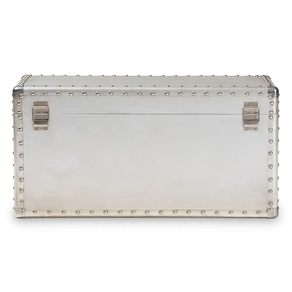 Add cool, vintage industrial-inspired storage to your space with the Serge trunk. Constructed from metal, the Serge features a spacious inner storage compartment. Modeled after antique steamer trunks, the Romain is accented with silver metal handles and imitation locks. Rivets add an extra dose of industrial style. Use the Serge to store extra blankets, pillows, and more. The Serge trunk is made in China and will arrive fully assembled.