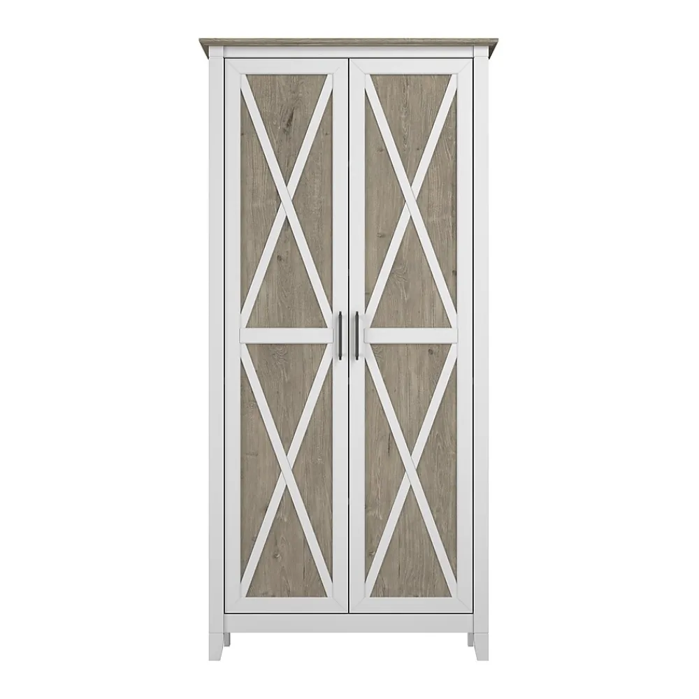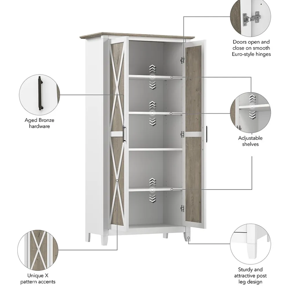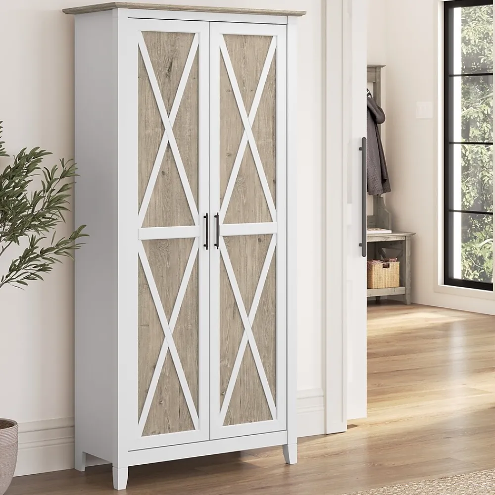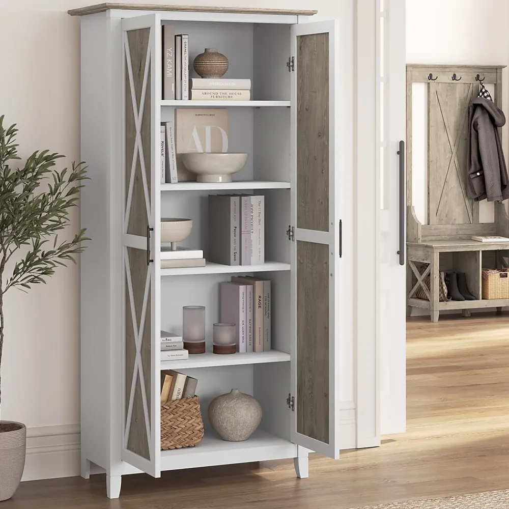 The Bush Furniture Key West Tall Storage Cabinet with Doors and Shelves offers an organization solution that brings a touch of casual style to any residential space. Featuring a design that’s as versatile as it is practical, this 2 door farmhouse cabinet provides an ideal way to store important work materials, a collection of books or other media, miscellaneous household items and more. Two shelves are fixed for stability while three can be raised or lowered to accommodate items of various sizes. Each shelf supports up to 25 pounds, so storing larger materials and equipment is never a problem. The stable design also includes wall attachment hardware for family-friendly safety in any home office or living space. This tall accent cabinet with doors has been meticulously tested to meet or exceed industry standards for safety and performance and is backed by a 1 Year Manufacturer’s Warranty.