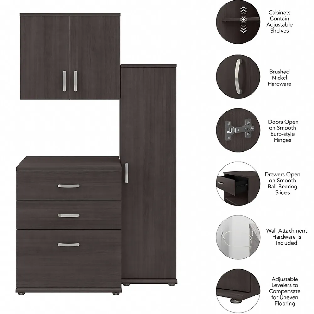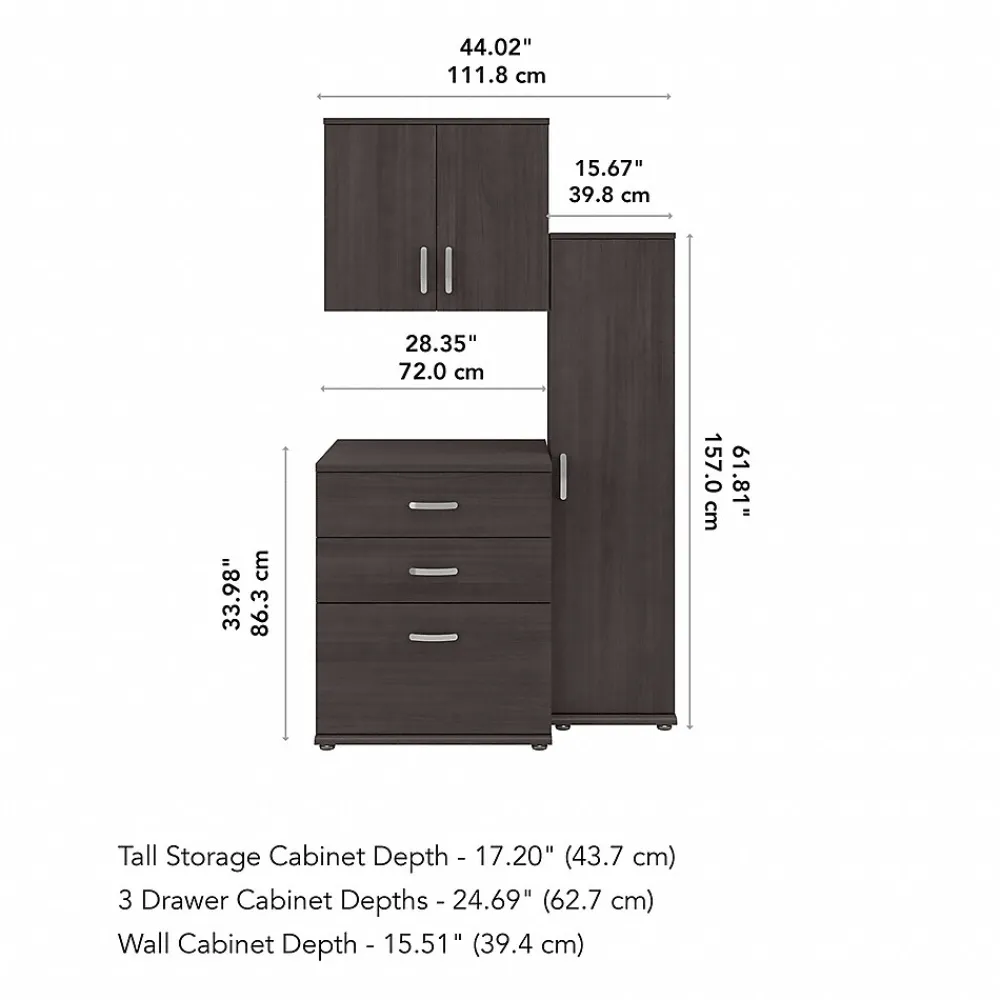 The Bush Business Furniture Universal 44″W three-piece modular storage set with floor and wall cabinets features commercial-quality designs and contemporary styling that suits virtually any home or professional environment. Organize your office, break room, garage, laundry room, or another work or living space with storage furniture that’s built to last and offers plenty of room for supplies, materials, and equipment. The tall narrow storage cabinet contains one fixed shelf and two adjustable shelves to accommodate items of various sizes. A wall-mounted cabinet also features one fixed and one adjustable shelf for flexible, space-saving storage. Additional office supplies, tools, and household items can be stashed inside the three-drawer cabinet. This durable floor and wall storage cabinet set has been tested to meet ANSI/BIFMA standards for safety and performance and is backed by a 10-year warranty.