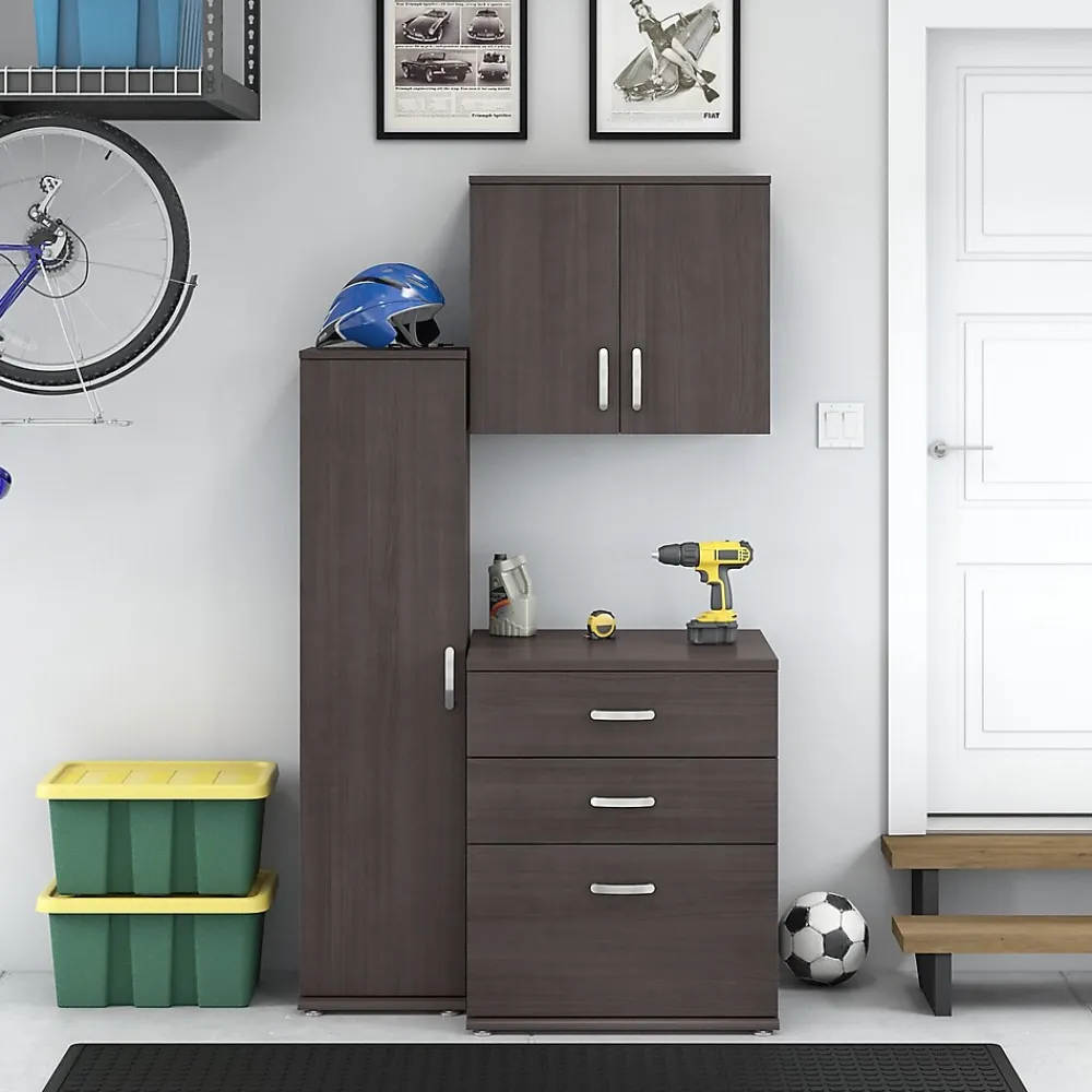 - Bundle includes: tall narrow storage cabinet, floor storage cabinet with drawers, wall cabinet with doors