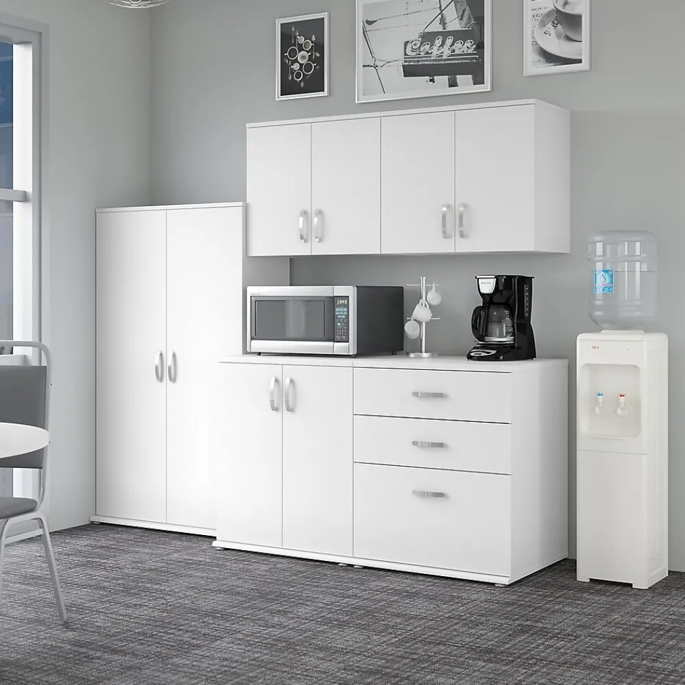 The Bush Business Furniture Universal five-piece modular storage set with floor and wall cabinets features commercial-quality designs and contemporary styling that suits virtually any home or professional environment. Organize your office, break room, garage, laundry room, or another work or living space with storage furniture that’s built to last and offers plenty of room for supplies, materials, and equipment. Both the floor storage cabinet with doors and tall storage cabinet combine fixed and adjustable shelving to accommodate items of various sizes. Two wall-mounted cabinets also contain one fixed and one adjustable shelf each for flexible, space-saving storage. Additional office supplies, tools, and household items can be stashed inside the three-drawer cabinet. This cabinet set has been tested to meet ANSI/BIFMA standards for safety and performance and is backed by a 10-year warranty.
