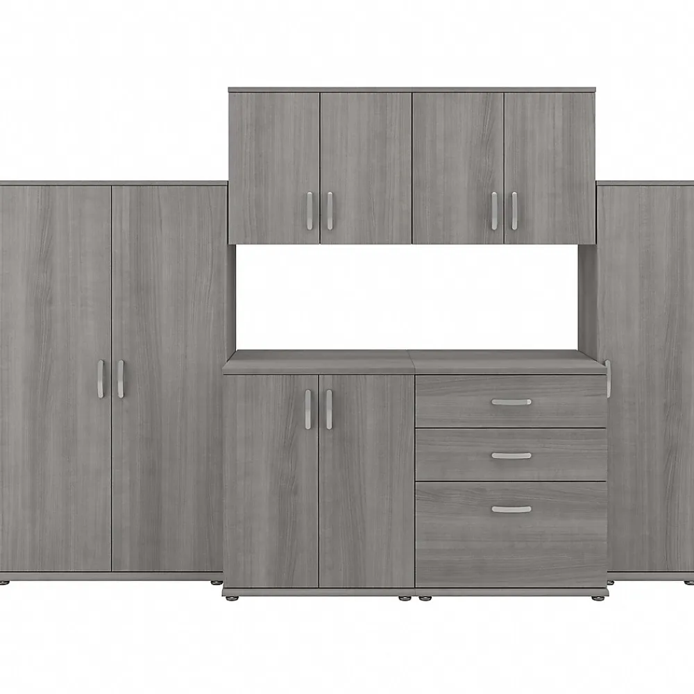 The Bush Business Furniture Universal 108″W six-piece modular storage set with floor and wall cabinets features commercial-quality designs and contemporary styling that suits virtually any home or professional environment. Organize your office, break room, garage, laundry room, or any other work or living space with storage furniture that’s built to last and offers plenty of room for supplies, materials, and equipment. The floor storage cabinet with doors, tall storage cabinet, and tall narrow storage cabinet combine fixed and adjustable shelving to accommodate items of various sizes. Two wall-mounted cabinets also contain one fixed and one adjustable shelf each for flexible, space-saving storage. Additional tools and supplies can be stashed inside the three-drawer cabinet. This cabinet set has been tested to meet ANSI/BIFMA standards for safety and performance and is backed by a 10-year warranty.