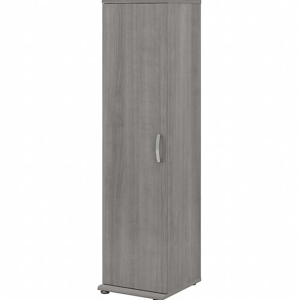 The Bush Business Furniture Universal tall narrow storage cabinet with door and shelves features a commercial-quality design and contemporary styling that suits virtually any home or professional environment. Organize your office, break room, garage, laundry room or any other work or living space with a tall skinny cabinet that’s built to last and boasts plenty of storage capacity. The door opens to reveal one fixed shelf and two adjustable shelves for flexible storage of office supplies, tools, household items, and more. Each shelf supports up to 35 lbs., so storing larger materials and equipment is no problem. The floor cabinet’s base has adjustable levelers to compensate for uneven surfaces, and wall attachment hardware is included for maximum stability. This tall narrow cabinet has been tested to meet ANSI/BIFMA standards for safety and performance and is backed by a 10-year warranty.