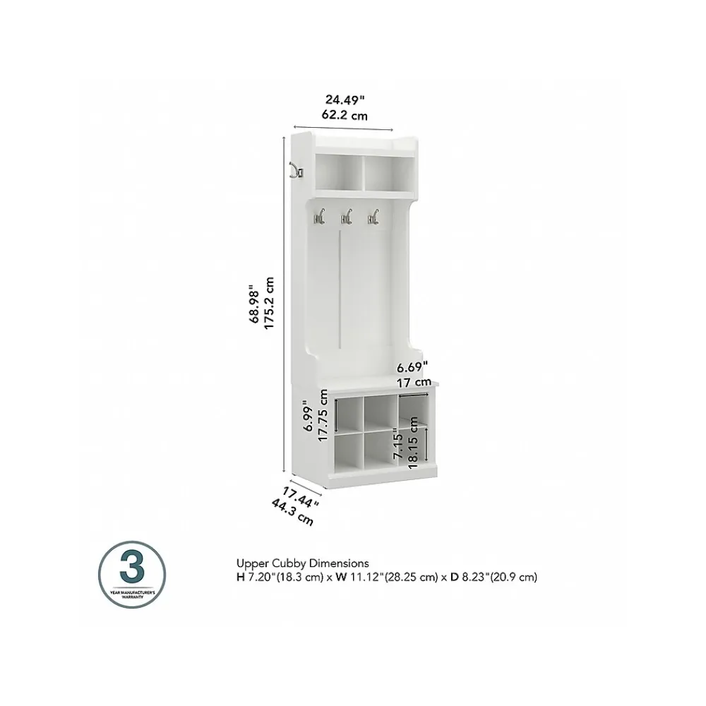 The Bush Furniture Woodland 24W Hall Tree and Small Shoe Bench with Shelves combines transitional styling and a practical design to offer an ideal entryway organizer. Have a seat on the durable bench and take a moment to relax as you get ready to head out the door or come home after a long day. The top of the mudroom bench supports up to 250 pounds, so you can sit down to put on and take off your shoes or set bags down with confidence. Six built-in cubby spaces keep your home organized while providing easy access to footwear. The narrow Hall Tree features three coat hooks in the front and one on each side for hanging jackets, hats, and more. Smaller items like gloves and keys can be stashed inside two open compartments. This entryway bench with storage has been rigorously tested to meet Bush Furniture’s standards for safety, performance and durability and is backed by a 3 Year Warranty.