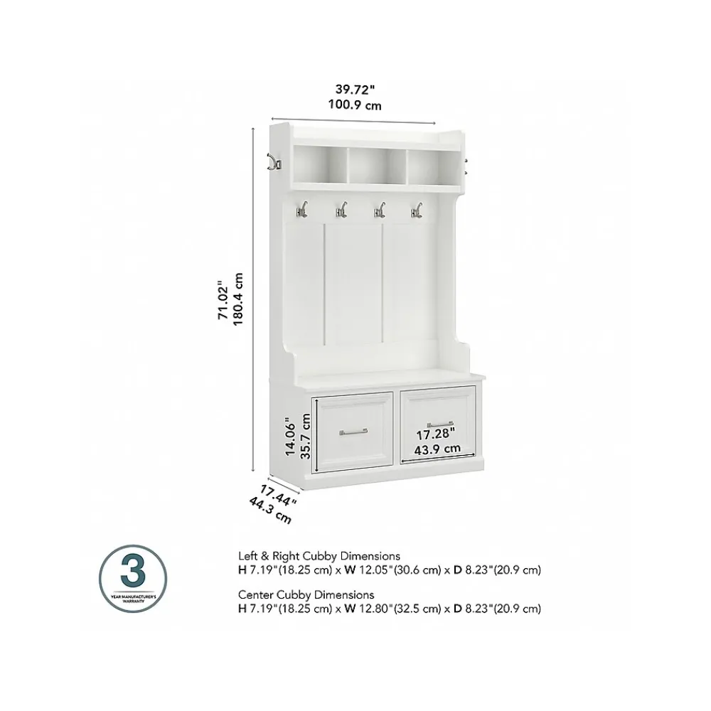 The Bush Furniture Woodland 40W Hall Tree and Shoe Storage Bench with Doors combines transitional styling and a practical design to offer an ideal entryway organizer. Have a seat on the durable bench and take a moment to relax as you get ready to head out the door or come home after a long day. The top of the mudroom bench supports 250 pounds, so you can sit down to put on and take off your shoes or set bags down with confidence. Cabinet doors conceal two internal compartments that keep footwear in order and out of sight. The Hall Tree includes four coat hooks in the front and one on each side for hanging jackets, hats, scarves and more. Smaller items like gloves and keys can be stashed inside three open cubby spaces. This entryway bench with storage has been rigorously tested to meet Bush Furniture’s standards for safety, performance and durability and is backed by a 3 Year Warranty.