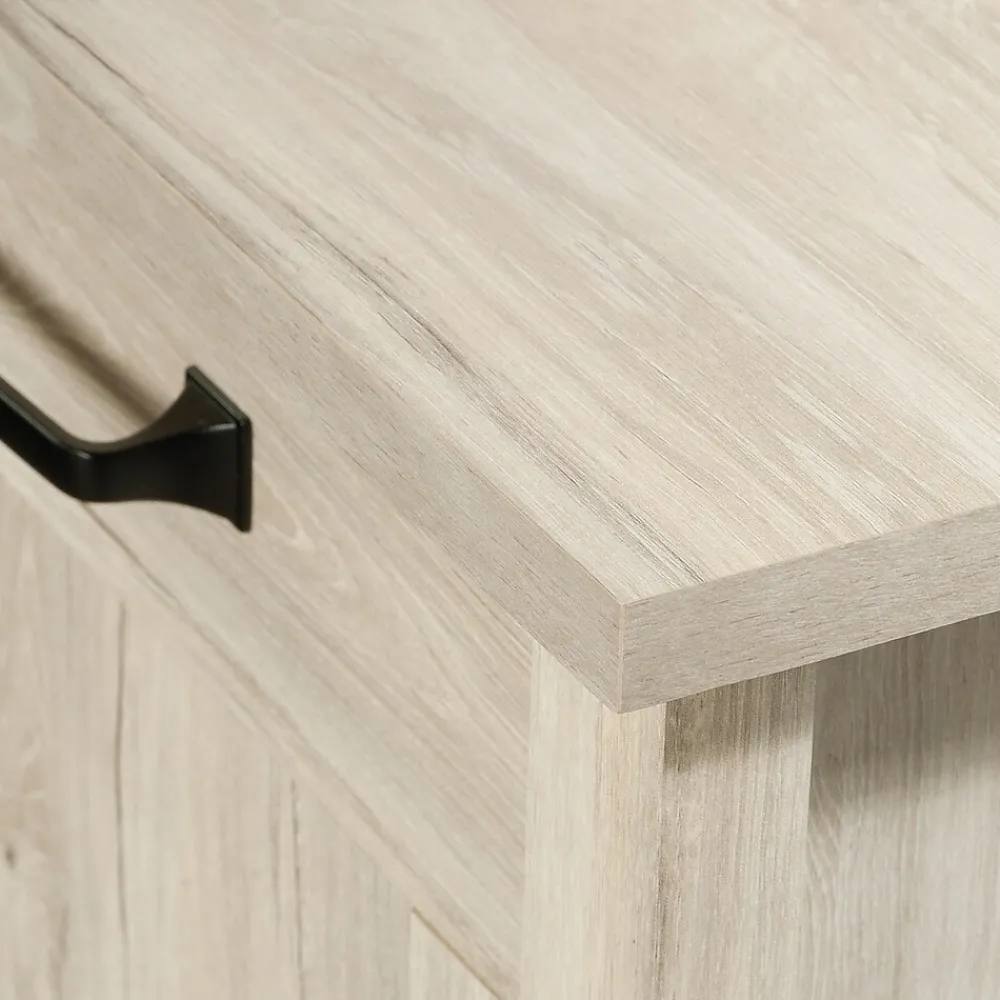 Boost your style while elevating your organization level with the Sauder Select 3-door storage cabinet. This sophisticated storage cabinet with doors seamlessly combines an elegant and classic aesthetic with ample storage solutions. Behind its three trendy, framed doors lie hidden compartments and adjustable shelves, offering versatile configurations for items of all sizes, including space for 12 x 12 storage bins (sold separately). From dinnerware, tablecloths and napkins to board games, books and puzzles, this 3-door console cabinet accommodates a diverse range of household necessities. The framed door fronts of this sideboard storage cabinet are adorned with visually appealing, dark, contrasting hardware. Crafted in a light and neutral finish, this console storage cabinet provides a spacious top surface for showcasing cherished family photos, a stylish lamp, or a selection of festive holiday decor. Finished in delicate Chalk Oak, this cabinet embodies both form and function for an exquisite storage solution.