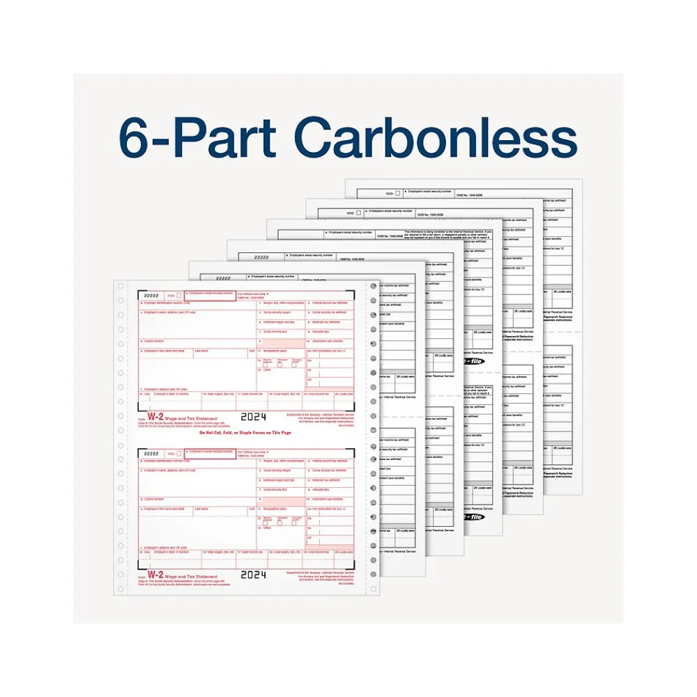 Get the 2024 IRS Form W2 on continuous feed paper for pin-fed dot-matrix printers. Pack includes 24 6-part W2s and 3 W3 forms.